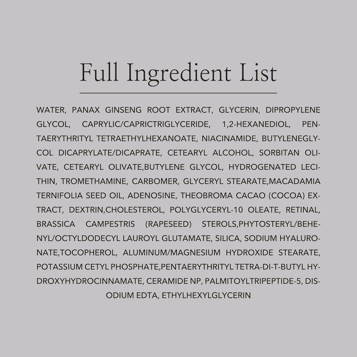 Water, panax ginseng root extract, glycerin, dipropylene glycol, caprylic/caprictriglyceride, 1,2-hexanediol, pentaerythrityl tetraethylhexanoate, niacinamide, butyleneglycol dicaprylate/dicaprate, cetearyl alcohol, sorbitan olivate, cetearyl olivate,butylene glycol, hydrogenated lecithin, tromethamine, carbomer, glyceryl stearate,macadamia ternifolia seed oil, adenosine, theobroma cacao (cocoa) extract, dextrin,cholesterol, polyglyceryl-10 oleate, retinal, brassica campestris (rapeseed) sterols,phytosteryl/behenyl/octyldodecyl lauroyl glutamate, silica, sodium hyaluronate,tocopherol, aluminum/magnesium hydroxide stearate, potassium cetyl phosphate,pentaerythrityl tetra-di-t-butyl hydroxyhydrocinnamate, ceramide np, palmitoyltripeptide-5, disodium edta, ethylhexylglycerin