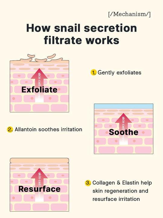 • 74.3% Triple Snail Complex : A complex that combines the existing hydrating and plumping effects of snail secretion filtrate and fortifies it with the anti-aging, pore contracting benefits of Black Snails and the anti-bacterial, antioxidant and UV protection effects of Gold Snails and more • 5% niacinamide : brightening the skin for simultaneous plumping & radiance care, strengthening skin's barrier • Glutathione : Improving skin tone and skin complexion